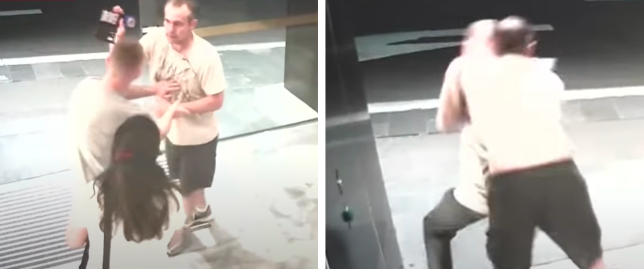 He reports telling the told the off-duty officer to leave the woman alone. The officer is then seen to grab him around the body, before Mr Minchin spins his body, causing the intoxicated officer to be thrown to the ground just outside the bank.